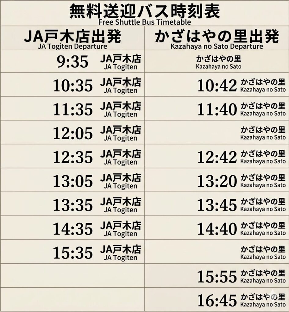 三重交通バス「戸木神社前」発着時に合わせ JA戸木駐車場 ⇄ かざはやの里入口を無料送迎バス で送迎します