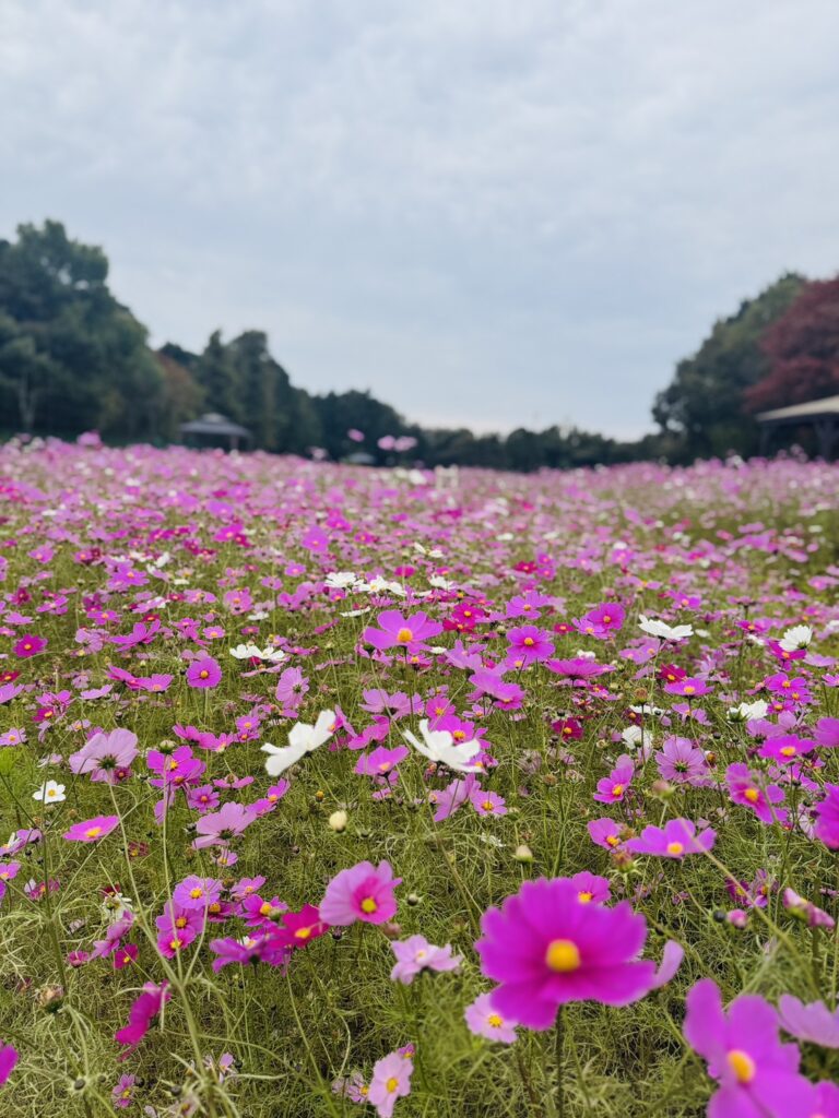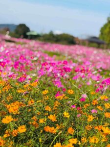 かざはやの里の秋桜畑は、風にゆれるピンク・白・濃紅の花が広がり、園内の散策路をやさしく彩っています。