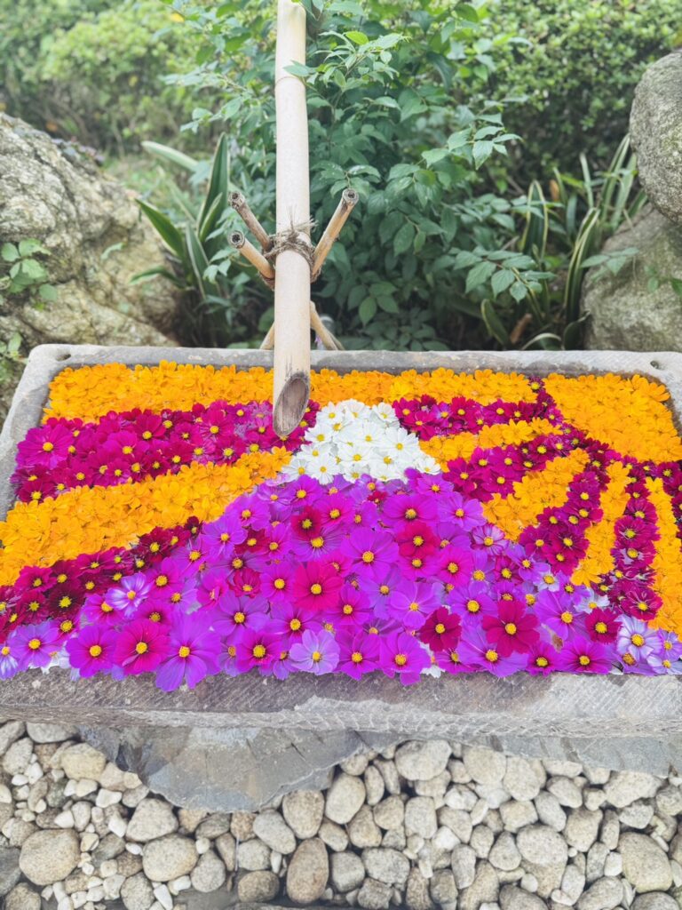 コスモスの花びらで描かれた富士山が、参拝のひとときを明るく包んでくれ元気な気持ちになれます。