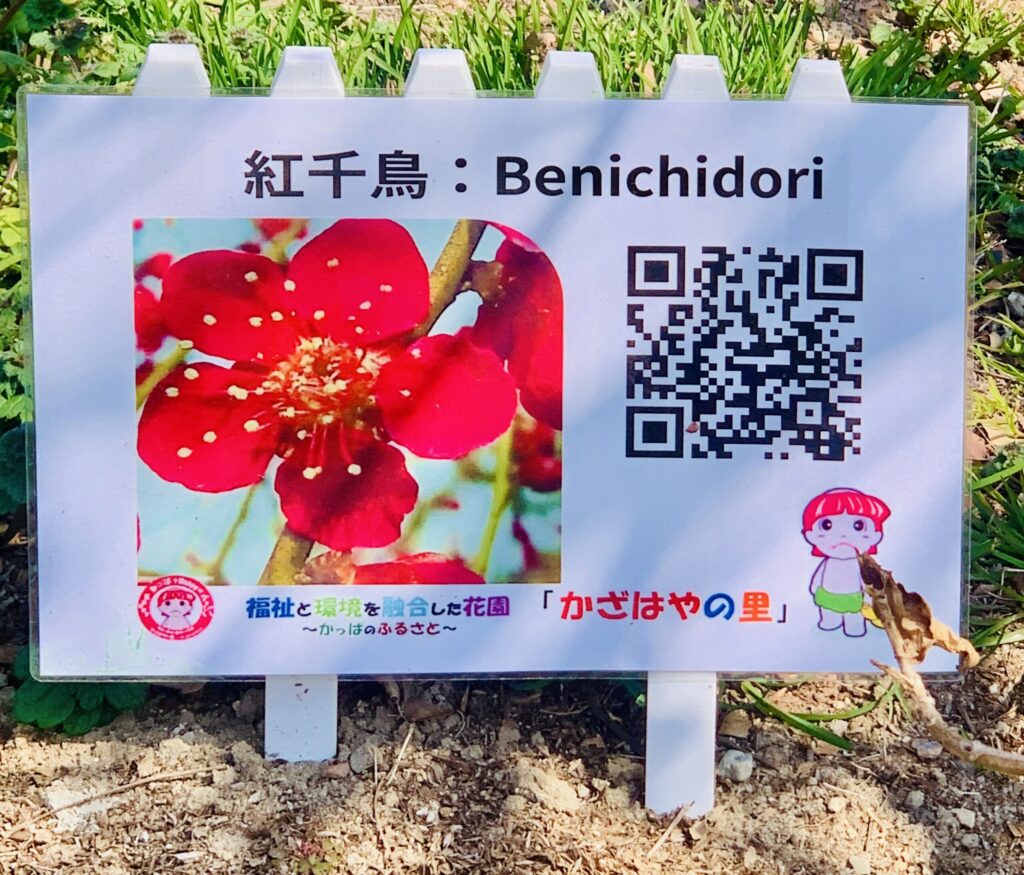 各品種の看板についたQRコードを読み取ると、その梅の詳しい解説が見られます。「紅千鳥 Benichidori」など珍しい品種も多数。