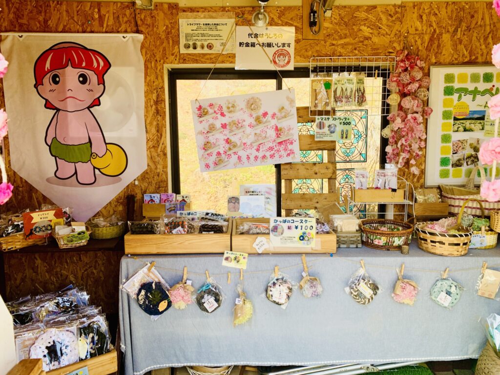 かわいい花グッズ・かっぱのコースター・ドライフラワー雑貨など、ここでしか買えないオリジナル商品がいっぱい。ガチャも人気です!