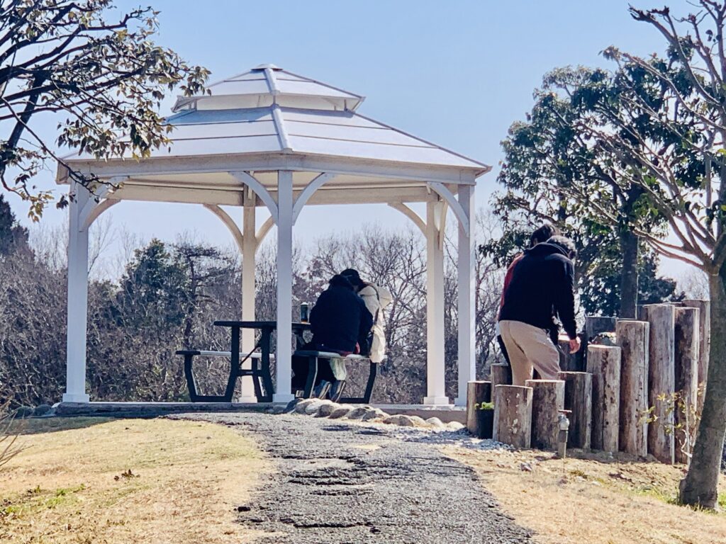 丘の上に建つ白いガゼボからは、梅林と里山の絶景が広がります。ゆっくり座って、春の風と景色を満喫してください。